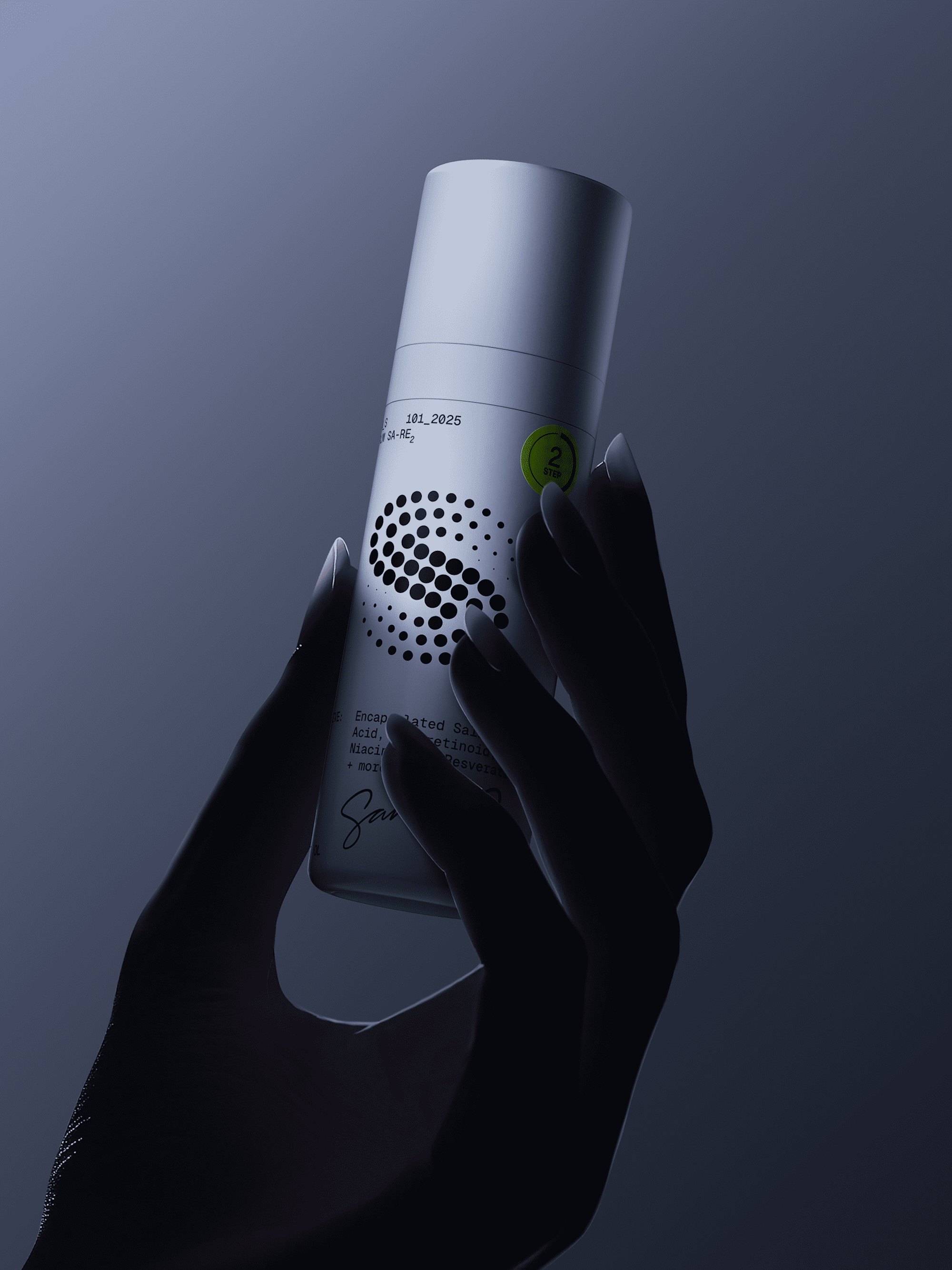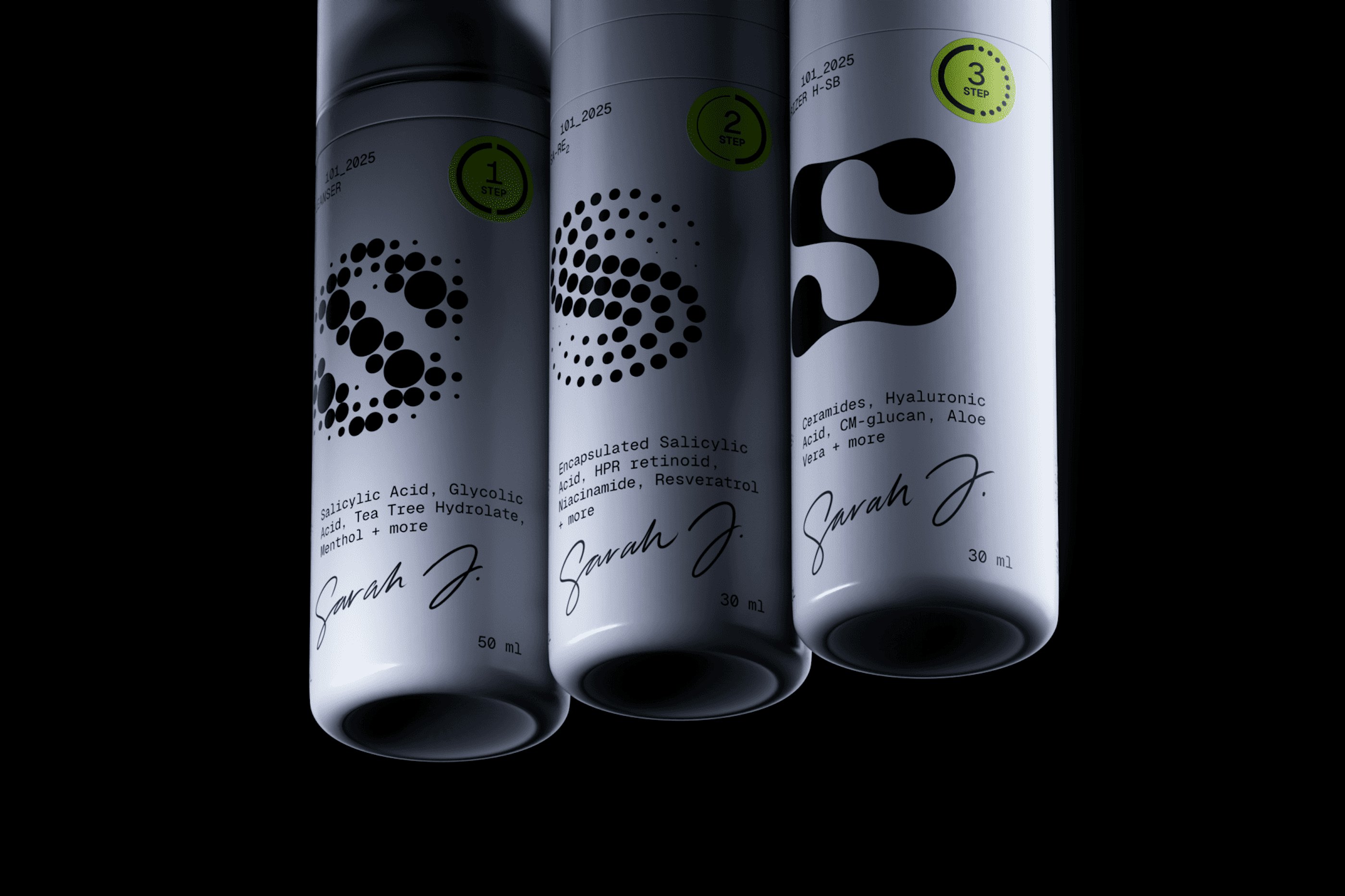 We created a visual identity that is minimal yet confident—rooted in bold simplicity with a human touch. The design system centers around the letter S, formed from modular dot units. These dots represent both blemishes and their transformations: a droplet of liquid, a particle of powder, a foam bubble—symbolic of care, change, and skin renewal.